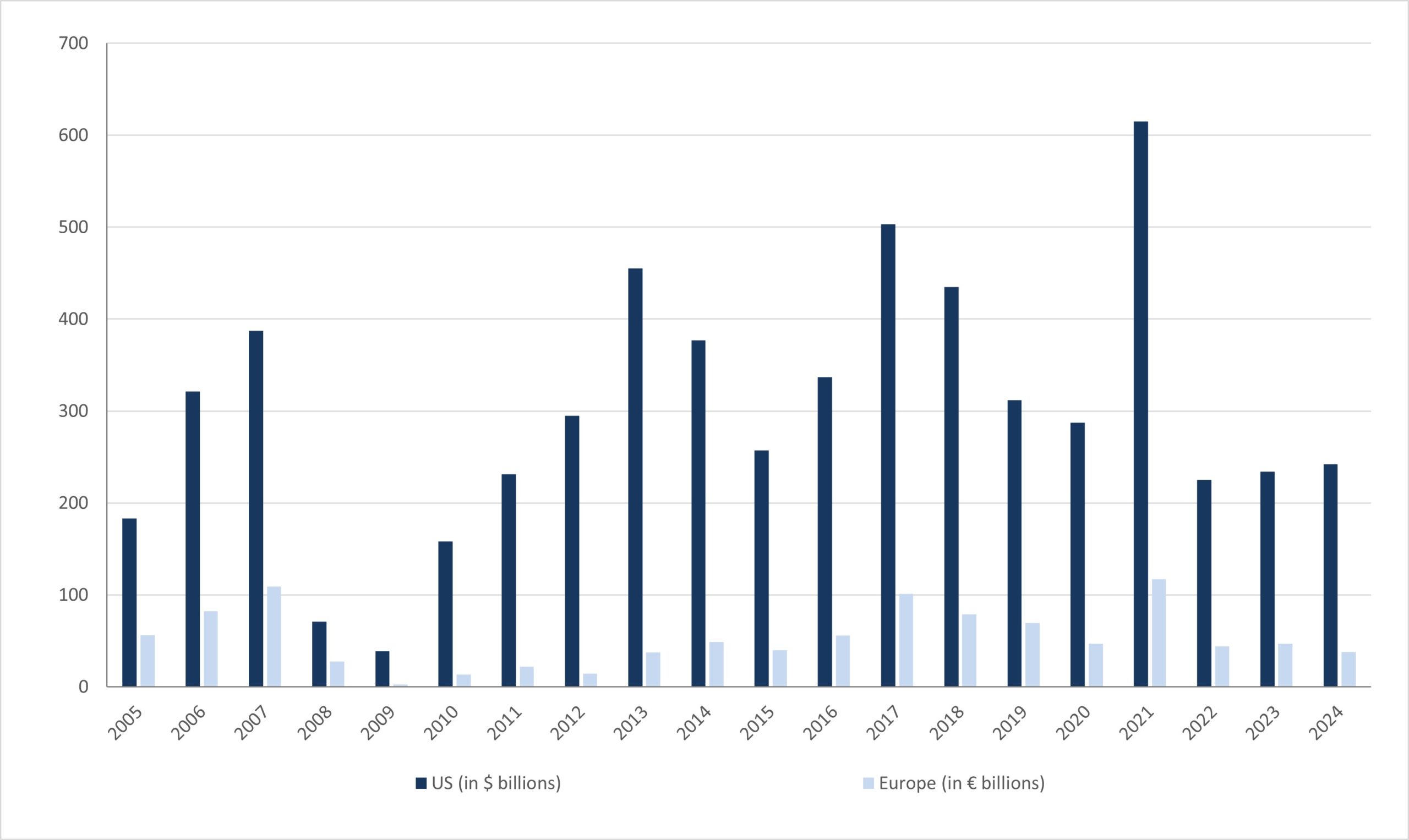 The institutional loan universe is more advanced in the US than in Europe. Considering the institutional loan issuance from 2010 to 2024, the loan issuance in the US accounts for $4,963 bn versus €773 bn in Europe.